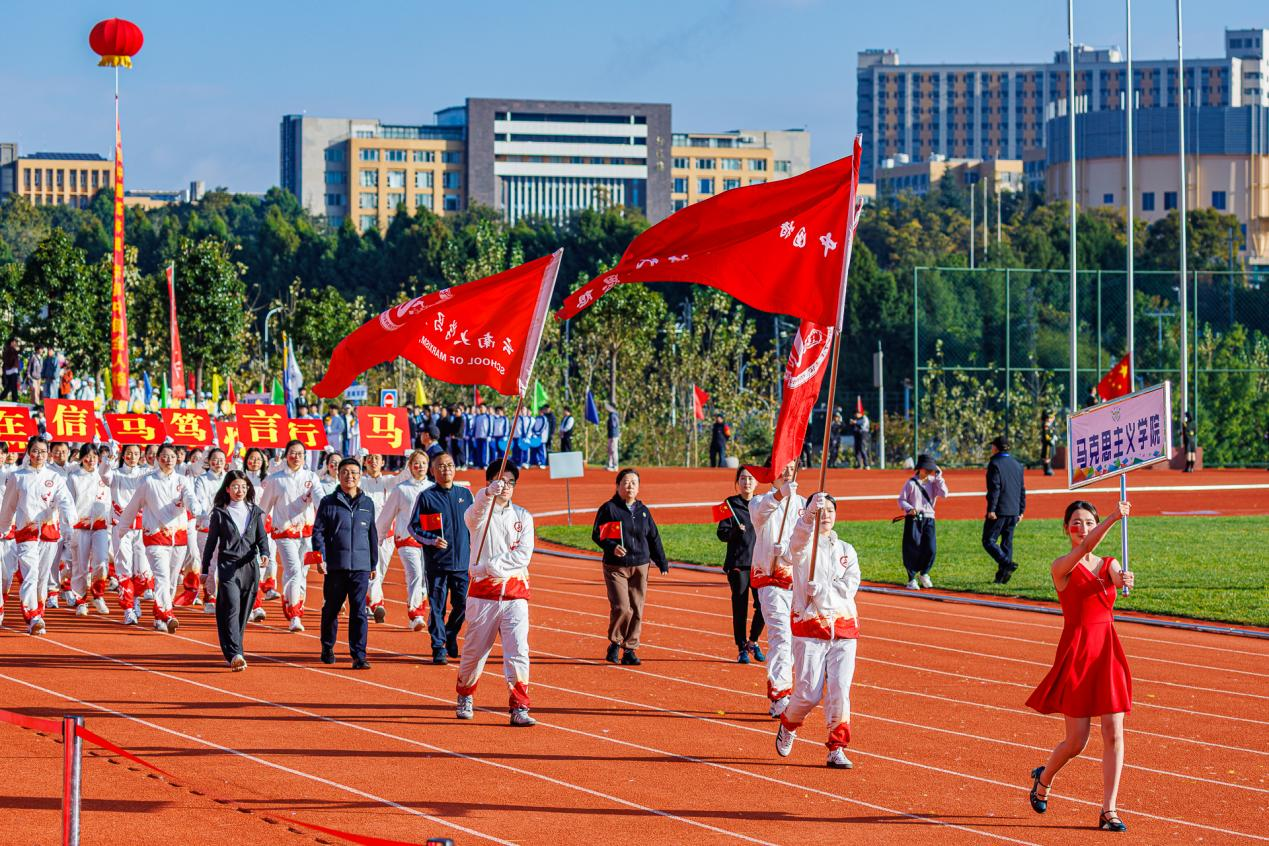 开幕式上,国旗方阵、校旗方阵、会徽方阵、鲜花队方阵、红旗队方阵、各学院、各部门代表队方阵依次进场。方阵中各具特色的字牌和道具,充分展示了各学院、各部门的独特风采与鲜明特色,更展现了BV1946官方网站师生们饱满的精气神和顽强拼搏的体育精神。每一个方阵的亮相,都赢得了热烈的掌声和喝彩声。