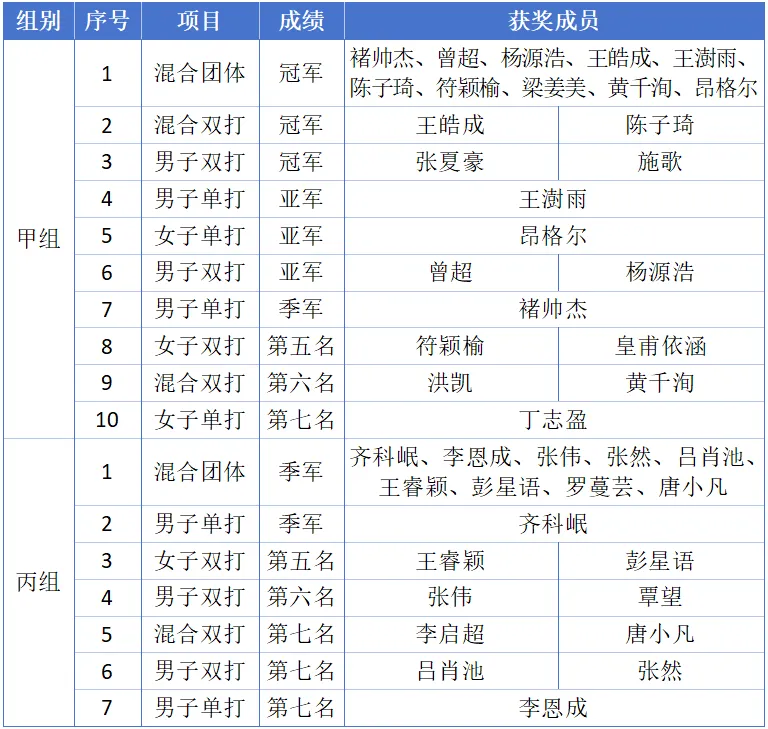 在本次赛事中,BV1946官方网站共派出27名队员参赛,整体发挥出色,几乎全员都斩获成绩。球队在团体赛和单项赛中全面开花,共荣获三金三银三铜的优异成绩。其中,甲组代表队继去年夺得男团、女团冠军后,今年再度获得混合团体冠军;在单项赛事上,男双包揽冠亚军,混双项目成功卫冕,男单获得第二、第三名,女单摘得第二名,并取得多个单项优秀名次。丙组代表队同样表现亮眼,斩获混合团体第三名、男单第三名及多个单项优胜奖项,实现了新的突破。